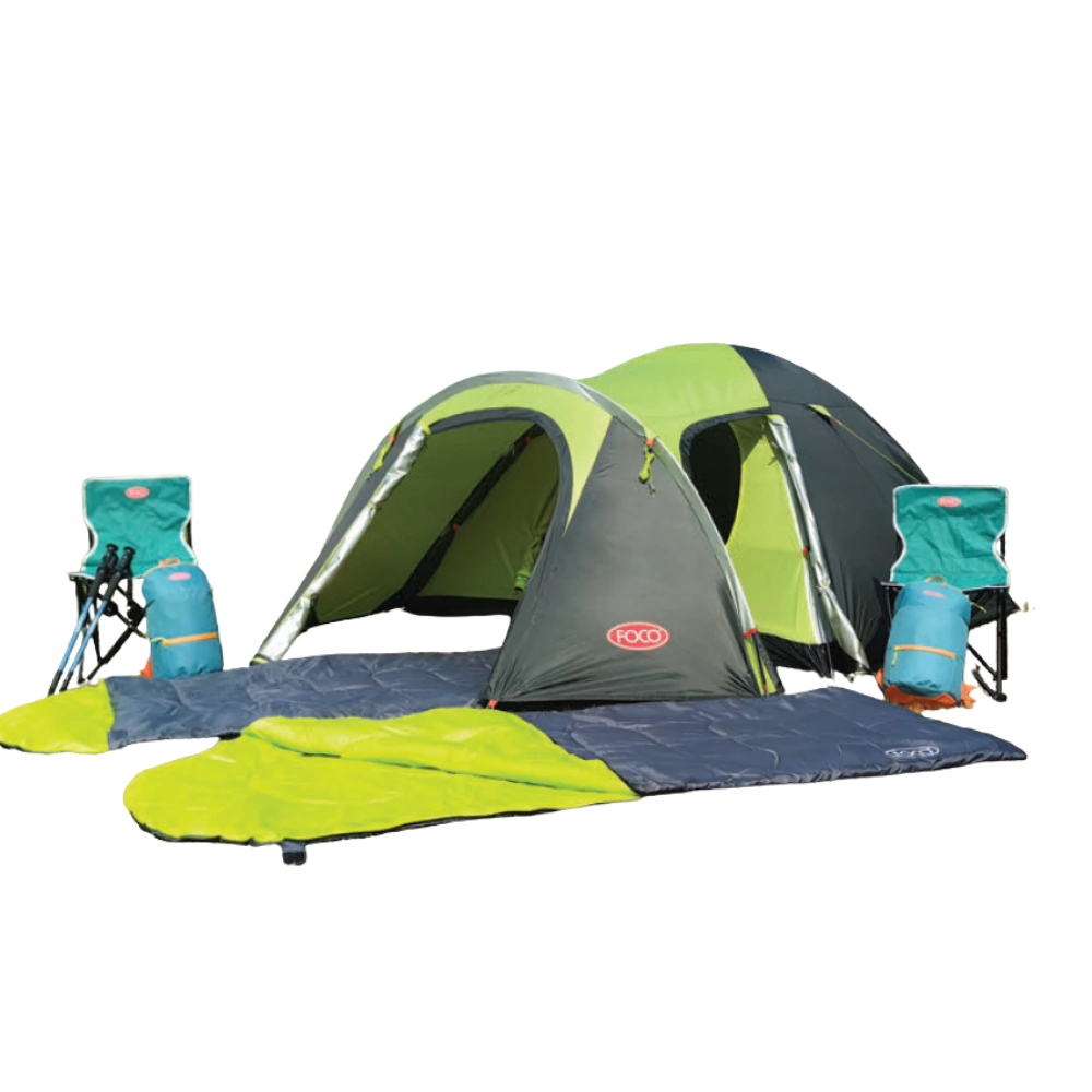 COMBO FOCO CARPA +2 SILLAS+ 2 BOLSAS DE DORMIR + 2 MOCHILAS + 2 BASTONES DE TREKKING